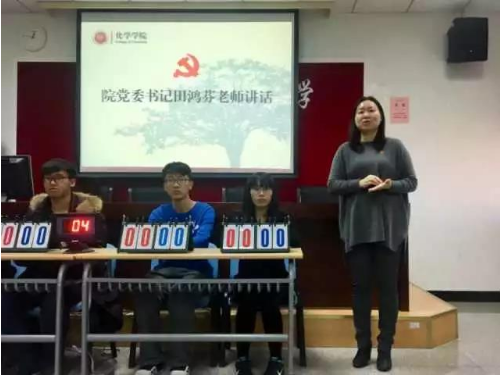 2017年12月6日12:20,化学学院以“党员肩负新使命,携手走进新时代”为主题的学习贯彻党的十九大与天津市第十一次党代会精神,全面迎接本科教学评估知识竞赛暨管理人员党支部与学生第一党支部联合主题党日在明理楼B区219室成功举办。出席本次活动的领导老师有化学学院党委书记田鸿芬老师、党委副书记金晶老师、副院长王波老师及学院各办公室的相关老师。