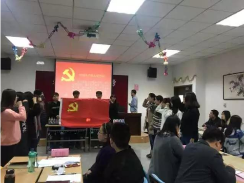 主题党日在国际歌的激昂乐声中拉开帷幕。首先,管理人员党支部的各位老师为学生第一党支部的预备党员们佩戴党徽,并由领誓人带领他们面向党旗郑重宣誓,共同庆祝11名新发展为预备党员同志的政治生日。田书记通过回顾自己的党员岁月与思想成长历程,表达了对同学们的殷殷嘱托与拳拳期望,希望大家不仅注重理论知识学习,提升自己的政治素质,更要有献身自我的精神,怀有一颗为祖国、为人民做奉献的心。田书记还以习总书记的反腐行动为例证,鼓励大家敢于挑战不公正,倡导大家积极践行社会主义核心价值观,不忘初心,坚定信念,加强党性。