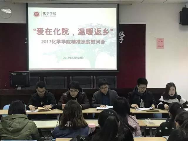 2017年12月22日中午12:30,化学学院在明理楼B区219举办了“爱在化院,温暖返乡”化学学院精准扶贫慰问会。化学学院党委副书记金晶老师,学工办辅导员孔明老师以及班主任代表陈晨老师、贺鸿明老师出席本次活动。慰问会由学工办辅导员佘晓晓老师主持。
