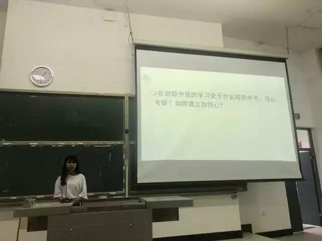 接下来是考入北京理工大学的刘媛媛学姐,她结合自己的考研经验告诉同学们决定考研后要尽早做真题,复习最后阶段一定要回归课本。同时,刘媛媛学姐还强调了英语口语的重要性。