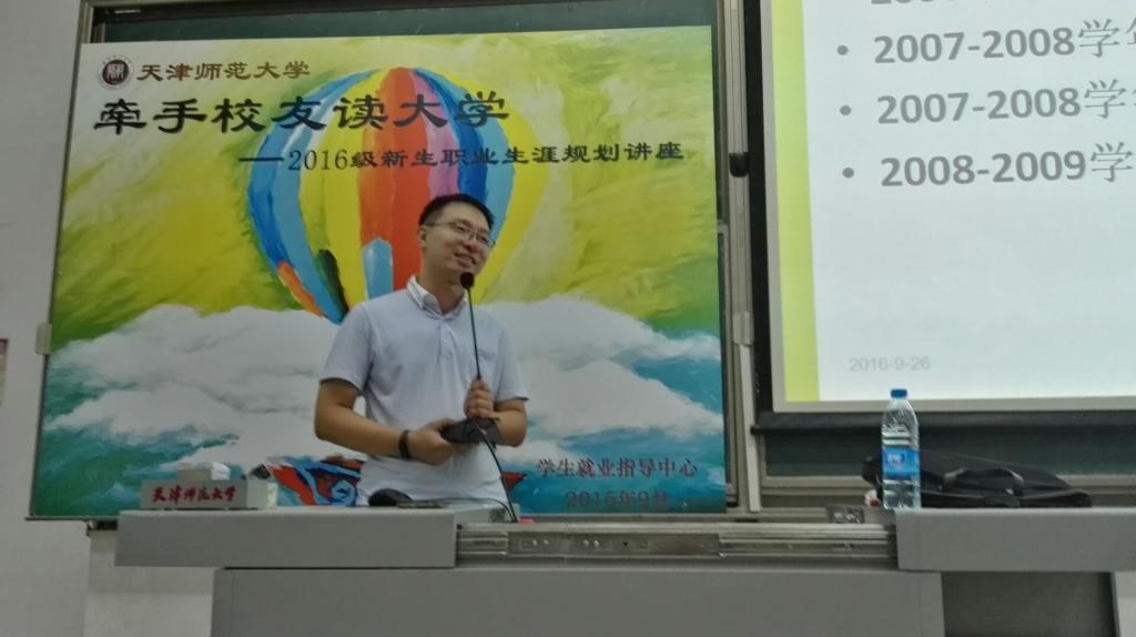 2016年9月26日晚六点半化学学院于劝A113举行了“牵手校友读大学”职业生涯规划讲座。本次讲座主讲人为化学学院优秀校友,天津市第四十三中学吴凯伦老师。