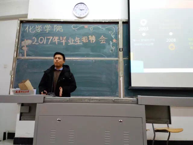 2016年12月28日、30日下午2:00,化学学院在劝A313、315成功举办了化学学院2017届毕业生专场招聘会。出席本次活动的有:化学学院党委副书记金晶老师,学工办辅导员魏娜老师、张喜盈老师、毛栋老师、佘晓晓老师以及各招聘企业代表。