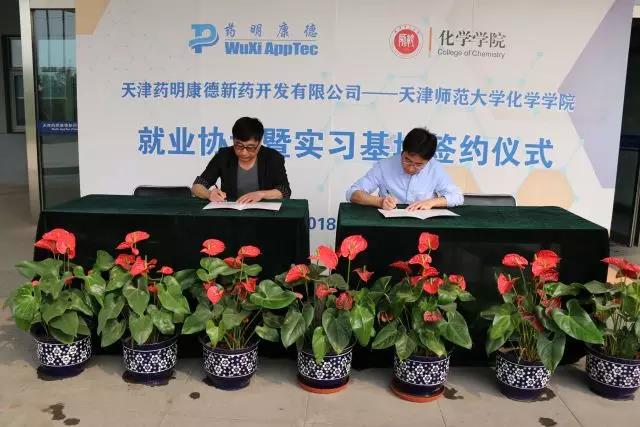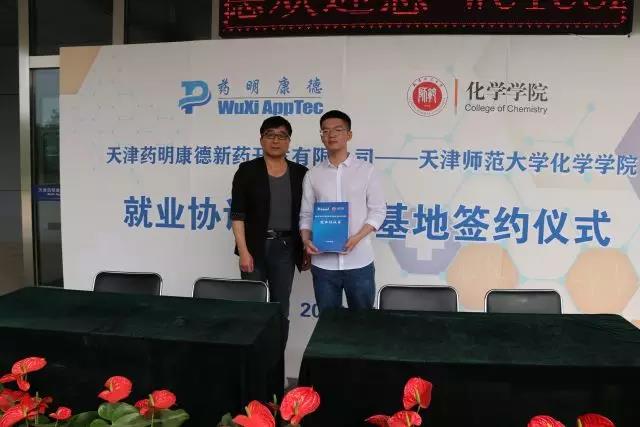 2018年4月26日下午,化学学院在天津药明康德新药开发有限公司举行了就业仪式暨实习基地签约仪式。化学学院副院长朱柏林老师、党委副书记金晶老师、辅导员老师以及43名研究生和本科生参加了此次活动。
