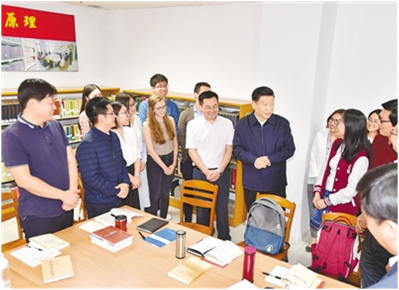 随后,习近平走进国际马克思主义文献中心,察看馆藏马克思主义典籍,询问“马藏工程”进展情况,称赞他们的工作非常有意义。阅览室里,一些中外学生正在就“解读新时代”进行座谈交流。习近平走到他们中间,认真倾听讨论,并同大家互动交流。总书记问大家为什么选择马克思主义专业、学习这个专业有什么体会,同学们兴奋地一一回答。同学们问总书记“您是一个坚定的马克思主义者,您学习马克思主义有什么好的方法”,总书记热情同大家分享了自己的学习经验。他对在场的外国留学生说,要了解中国,就要了解中国的历史、文化、人文思想和发展阶段,特别是要了解当代中国的马克思主义。习近平强调,北京大学是中国最早传播和研究马克思主义的地方,为马克思主义在中国的传播和中国共产党的成立作出了重要贡献。今年是马克思诞辰200周年,也是《共产党宣言》诞生170周年。我们对马克思和《共产党宣言》的最好纪念,就是把党的十九大精神和新时代中国特色社会主义思想这一当代中国马克思主义研究好、宣传好、贯彻好。他勉励大家紧密联系世情国情党情的变化,认真开展新时代中国特色社会主义思想研究,拿出更多有分量有说服力的研究成果。